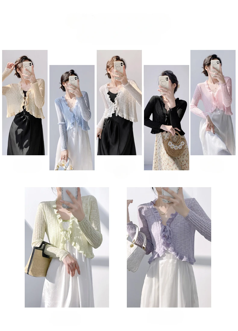 Lace Trim One Button Long Sleeve Crop Top Women Short Sleeve Open Front Ribbed Knit Cardigan Sweater Summer Fairycore Outfit